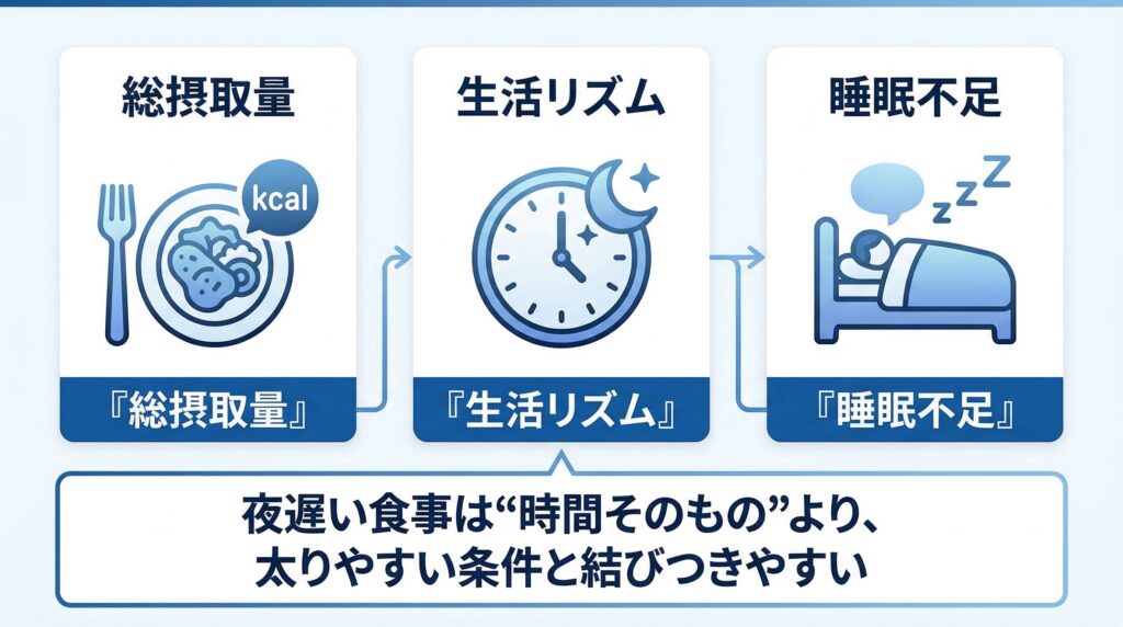 夜遅い食事が総摂取量の増加、代謝の不利、生活リズムの乱れ、睡眠不足と重なりやすいことが問題