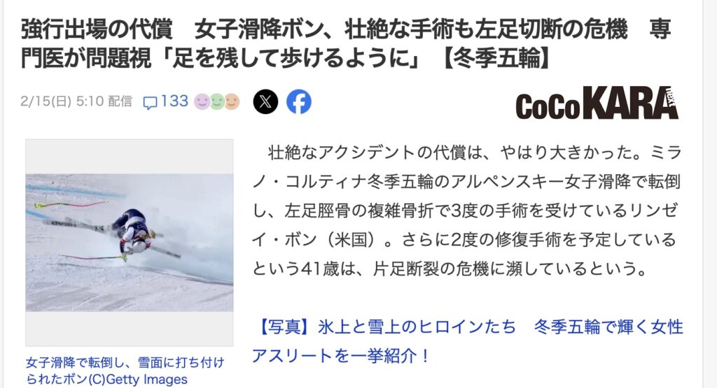 同大会の女子アルペンスキーでは、重度の外傷を抱えながら大舞台に挑んだ結果、深刻な状態に陥ったケースが報じられました。
